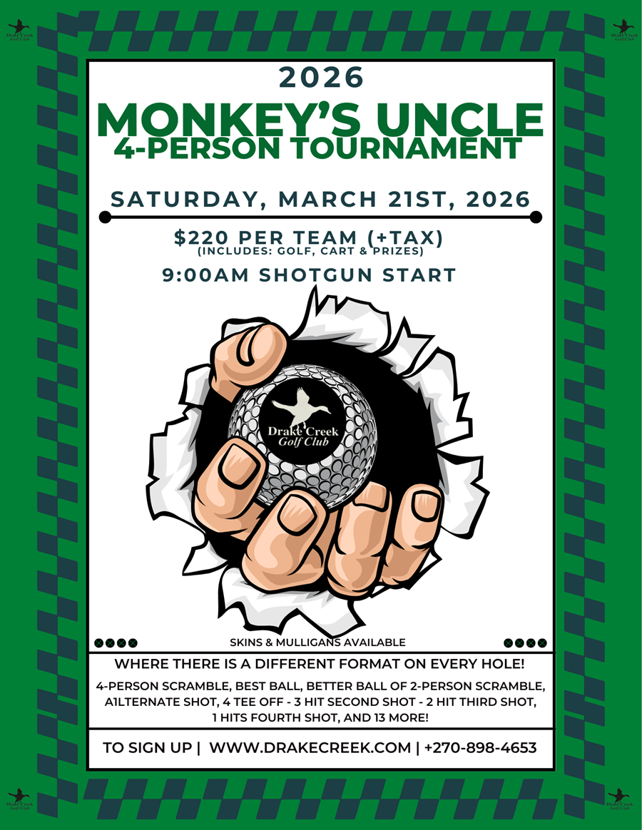 The 2026 Monkey’s Uncle 4-Person Tournament is back at Drake Creek Golf Club on Saturday, March 21st, 2026, and you won’t want to miss out!