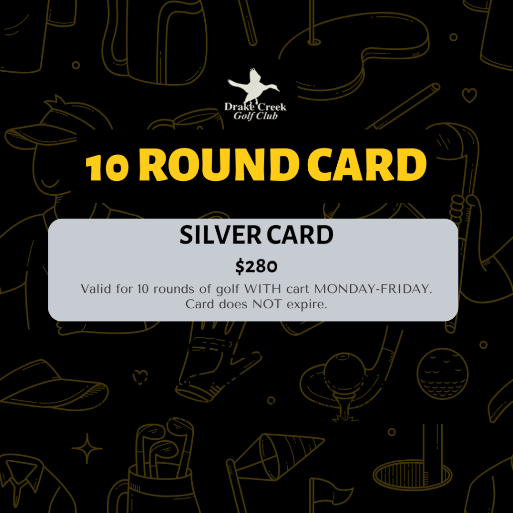 Valid for 10 rounds of golf WITH cart MONDAY through FRIDAY. The card DOES NOT expire. All fees are plus tax.