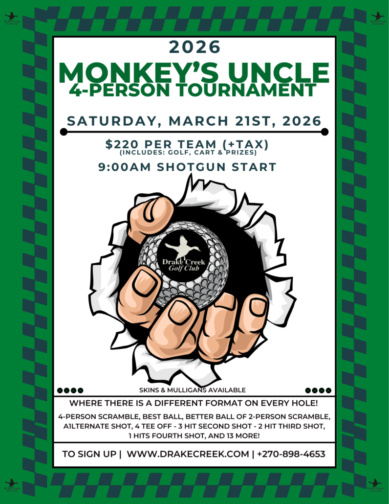 Are you ready for a tournament like no other? The 2026 Monkey’s Uncle 4-Person Tournament is back at Drake Creek Golf Club on Saturday, March 21st, 2026, and you won’t want to miss out!